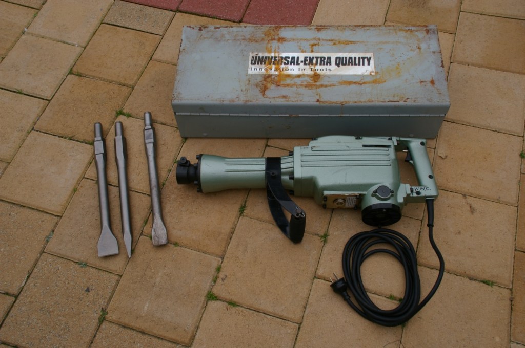 A large upright 240v powered jackhammer, using point, chisel, bitumen cutter and clay spade attachments, to complete a range of medium to heavy size demolition applications.